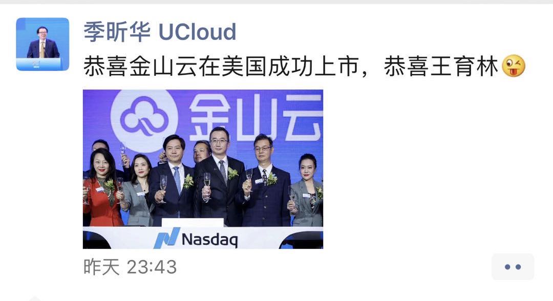 巧合的是,金山云、Ucloud、加上正在申请科创板上市的青云,三家云服务产商均诞生于 2012 年。八年耕耘换得龙门一跃,每家公司的上市新闻都成了企业服务圈子里的一件盛事。金山云上市当天,Ucloud 创始人季昕华、前美团云负责人李爽,都在朋友圈里表达了祝贺。