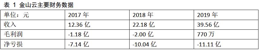 营收上,金山云在2017、2018及2019年的营收分别为12.36亿元、22.18亿元、39.56亿元,三年实现年均复合增长率为79%,但在毛利上,金山云在2019年刚刚实现毛利润转正。