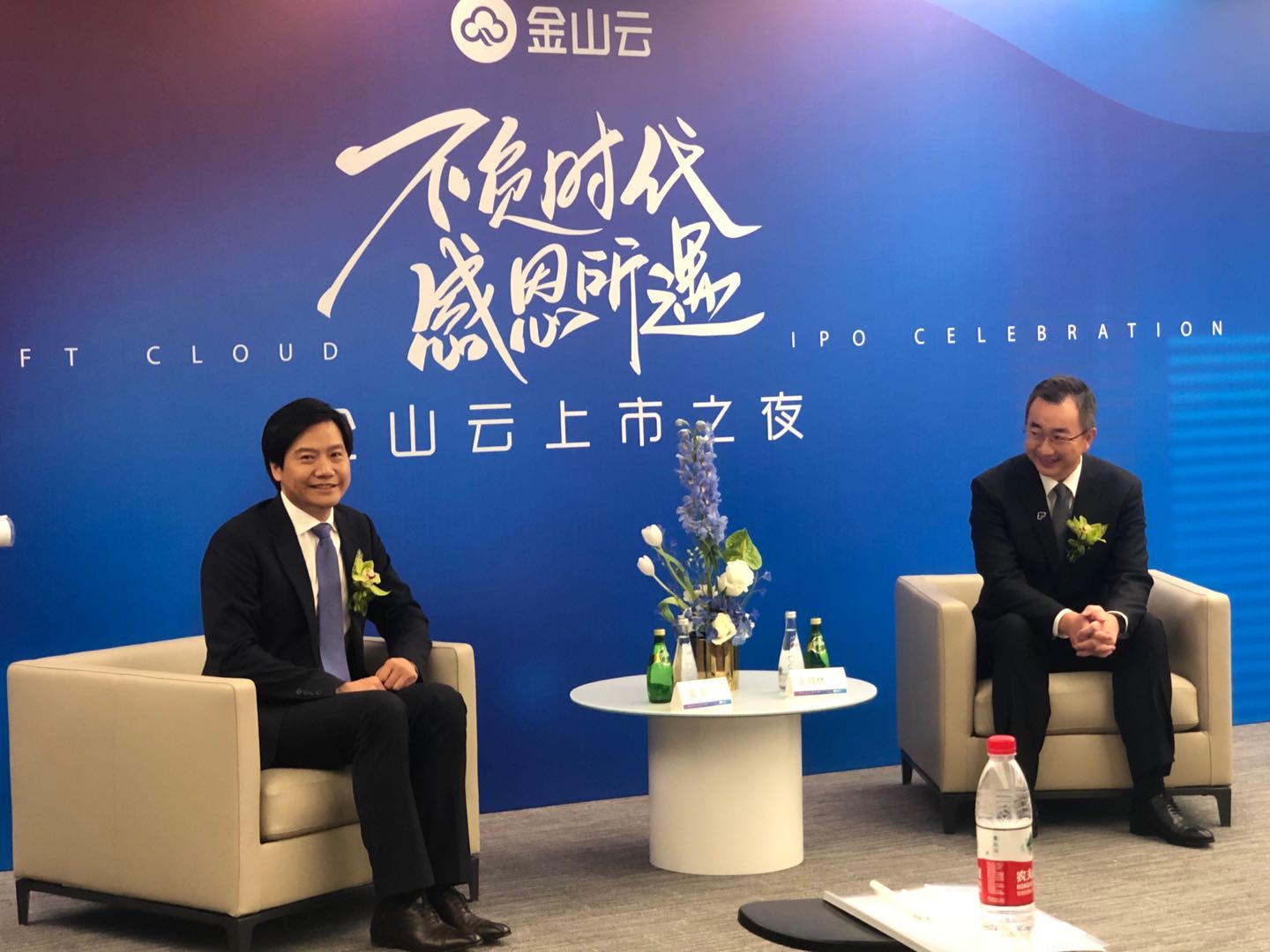 金山云上市当天,金山云董事长雷军、金山云 CEO 王育林(右)接受 36 氪等媒体采访。图片拍摄:苏建勋