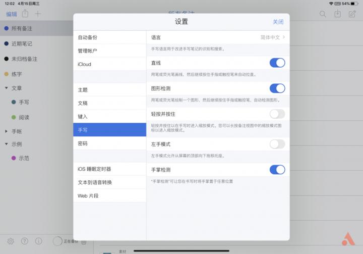 手写中可以根据自己的写字习惯进行设置,图形检测这个功能如果你没有绘制几何图形的需求那么可以将它关闭,开启后你的笔在笔记中停留时间过长的话,它就会自动检测将你画出来的内容变更为比较规整的方形、圆形或其它图形,做数学题的时候可以将它打开,可以非常方便进行图形绘制,好看又标准。