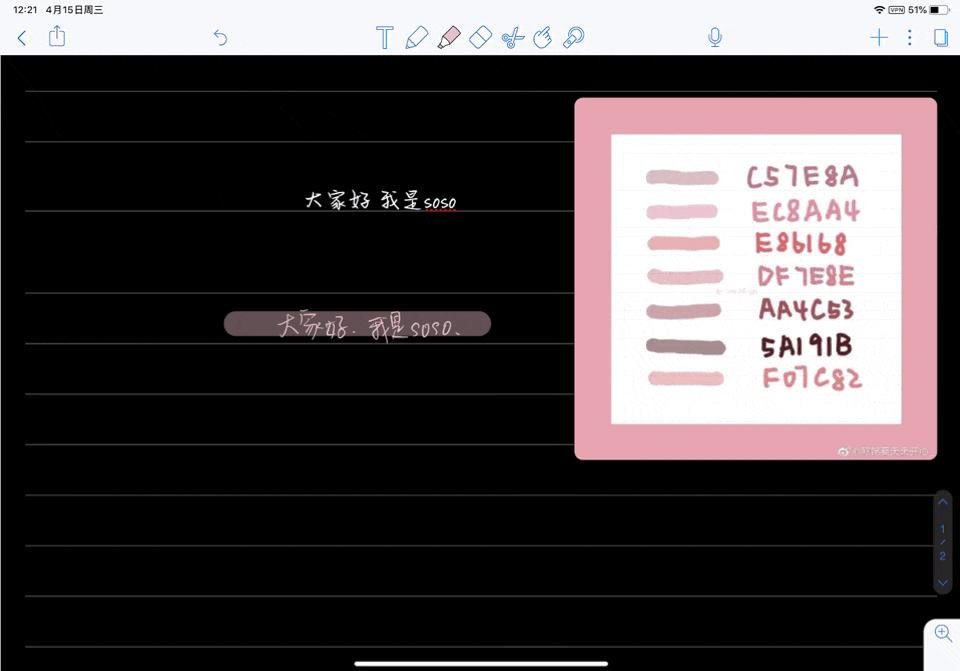 《Goodnotes》中也可以导入色卡添加颜色,不过没有吸色功能,只能输入颜色代码,另外它的普通笔和荧光笔颜色也是不同步的,如果荧光笔想要用新增加的颜色,需要再添加一次才可以使用。