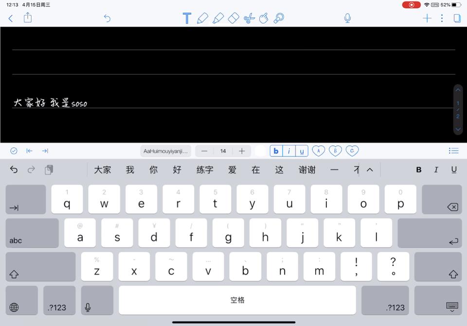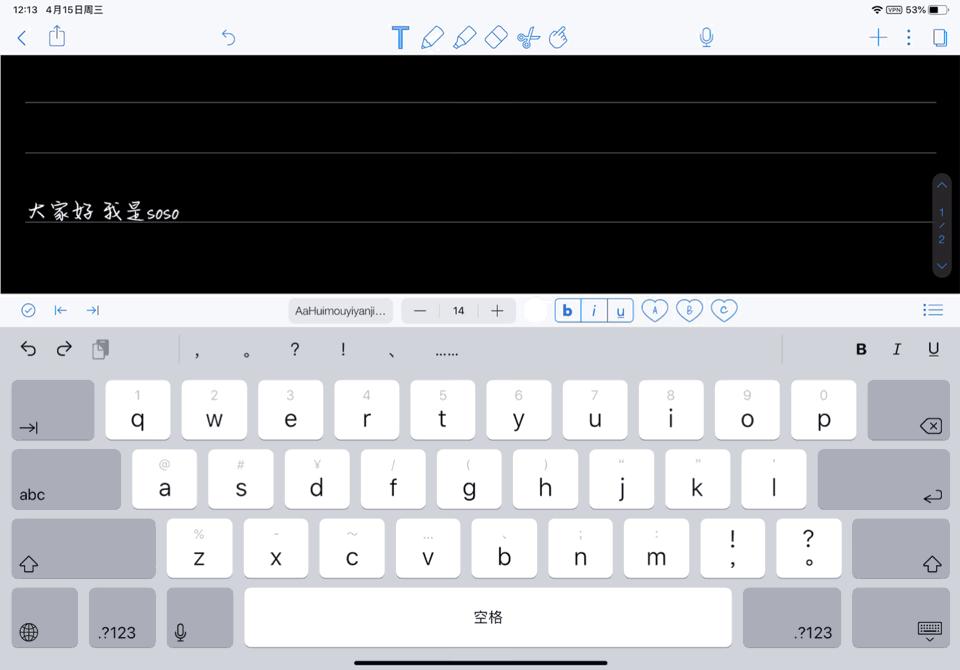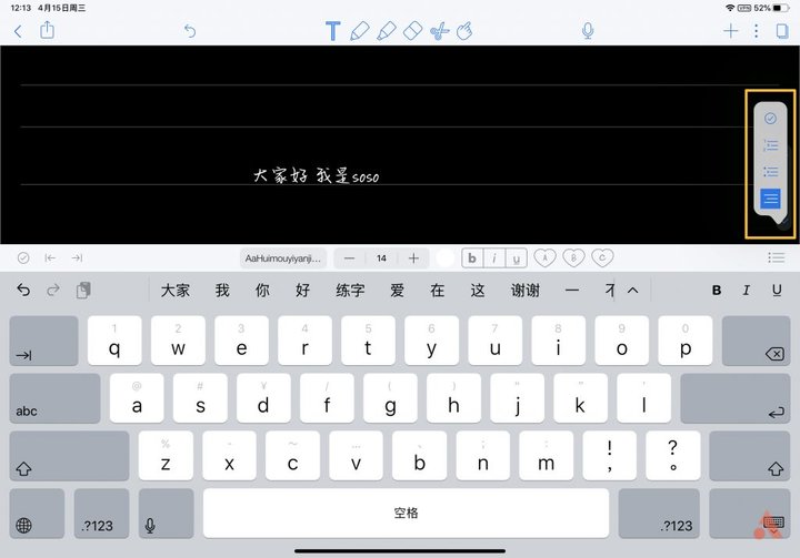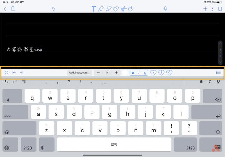 手写笔记中,文字键入功能虽然很少用到但它是不可或缺的,而且这里有些功能是比较有特色的,点击输入文字后可以看到键盘上方会出现一个工具条;