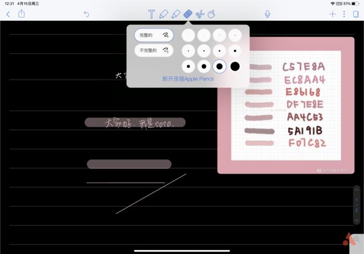 橡皮有两种样式,完整的和不完整的,选择完整的话,只要碰到手写笔记的边缘,那么整个笔记都会被擦除,不完整的就是只会擦除碰到的部分,二者可以搭配之用,我一般默认是完整的,擦除比较方便省力。