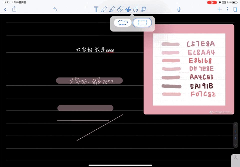 同样有两种样式,一种自由选区,另一种是方框选区,选中边缘就可以拖动整个手写笔记了,选框工具只作用于手写笔记,输入的文字是不能被选取的;