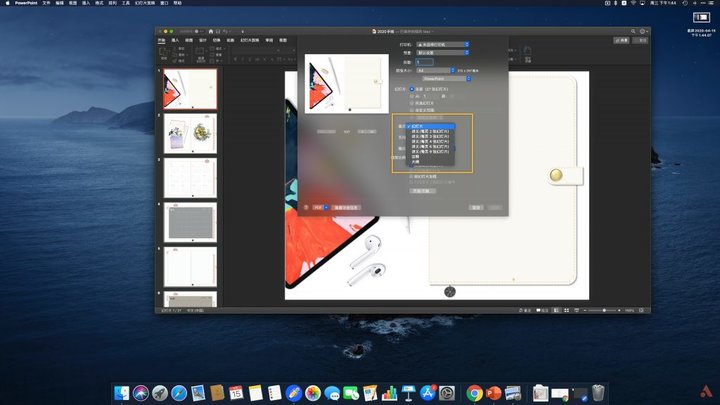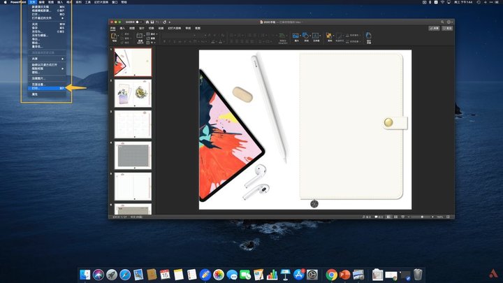 如果导入的文件是 PPT 转换为 PDF 的格式,那么我们可以预先在电脑上进行一些格式的设置来让这个文件在 iPad 上更美观地展示。首先打开 PPT 文件,以我制作的「2020 年手帐」为例,打开之后选择「文件」→「打印」进入打印页面;