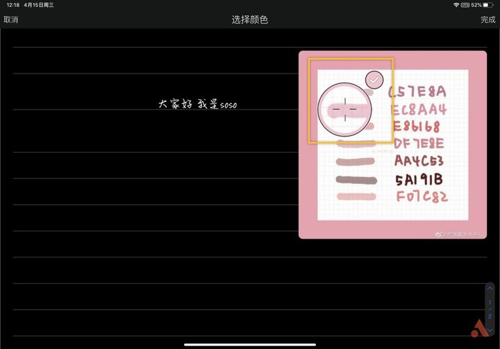 另一种是直接吸色,比如我将一张色卡导入,然后点击添加颜色,可以看到有一个吸管图标,点击将它移动到想要的颜色上然后确认就可以了,颜色就已经导入了,《Notability》中普通笔和荧光笔的颜色是通用的,也就是说颜色导入之后荧光笔也可以使用。