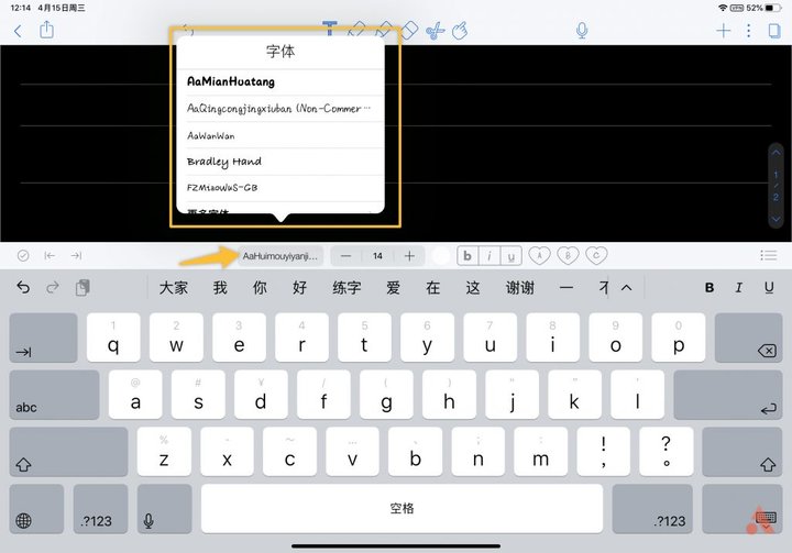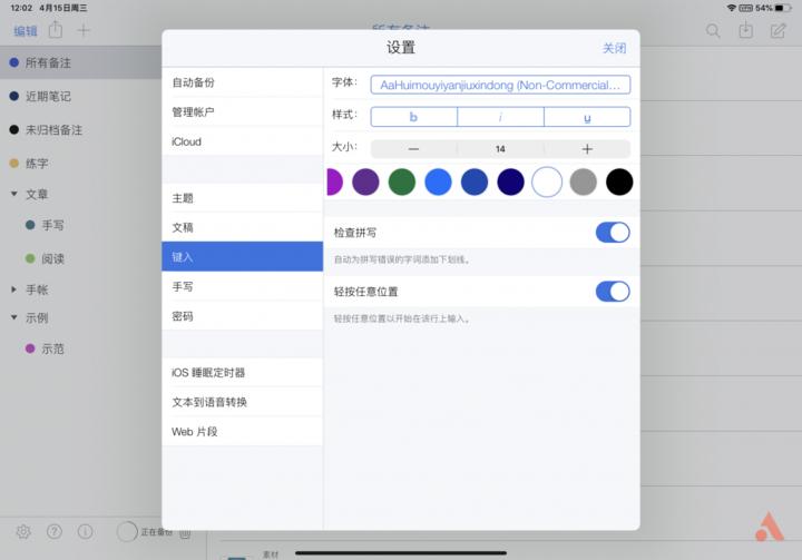 旁边还有「A」、「B」、「C」三个按钮,长按任意一个,可以调节字体、样式、大小和颜色,根据自己喜好设置后就代表收藏了这个样式的字体,可以收藏 3 个,这样在输入文字的时候可以直接点击「A」、「B」、「C」来切换预设好的字体。而《Goodnotes》中就只能是每次打开笔记的时候设置自己喜欢的字体和粗细了。
