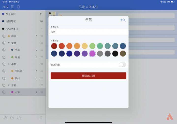 分割条和主题可以通过左滑删除,删除后在此类目下的笔记也会一并删除。