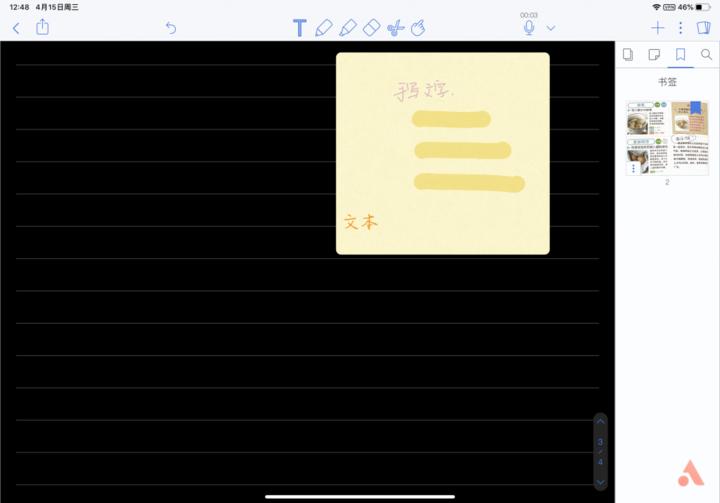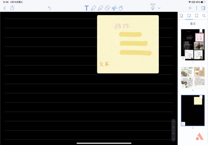 最后一个便笺功能,可以快速在笔记中插入便签,有不同格式可以选,还可以像设置笔记格式一样调节便签的颜色和纸张类型,除了在便签上手写之外,还能键入文字。