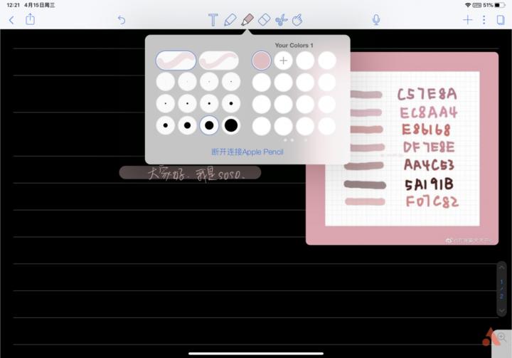 《Notability》字体颜色也是可以选择的,另外它还支持导入颜色,一共支持导入 36 种颜色,有 2 中导入方式,一种是记住喜欢颜色的代码,点击加号输入代码然后确认;
