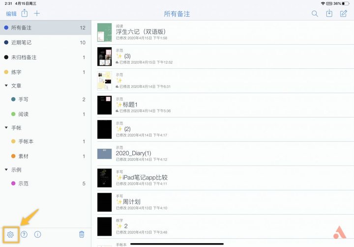 《Notability》可以直接上手使用记笔记,不过在记之前我们可以对它进行一些设置,这样使用起来会更顺手,首先打开应用主页,点击左下角齿轮图标进入设置。