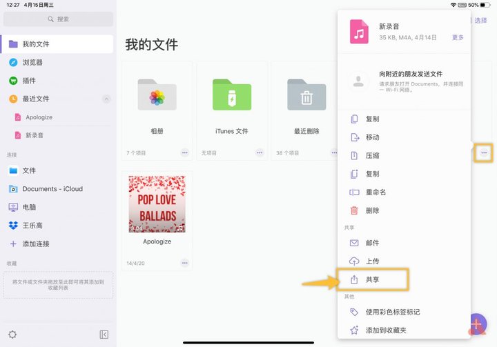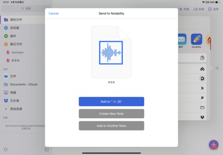 如果上课的时候没有录音,在课后老师同步了音频的话,也是可以导入到当前笔记的,首先打开录音,选择共享,在《Notability》中打开,可以添加到任意笔记中,也可以新建空白笔记,我将它导入到刚刚写的示范笔记中,然后再回到笔记中,点击管理录音就可以看到刚刚导入的录音已经出现点击就可以播放了,多余的录音可以向左滑删除来释放空间。