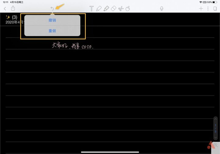 《Notability》中只有一个撤销的按钮,只能后退,如果某个内容撤销错了的话可以长按后退按钮进行重做,这一点《Goodnotes》比较人性化同时提供了撤销和返回按钮,不过《Notability》中可以利用手势来实现返回功能,发现某一部分撤销错了,三指向右滑,那么这一步就又出现了,相反的三指向左滑是撤销动作。
