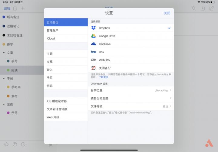 《Notability》可以定期进行自动备份,选择一项自己喜欢的服务就好,这里我选择《Dropbox》,这个备份是单向的,我在《Dropbox》中删除一个笔记,《Notability》仍然会保留不会被删除;