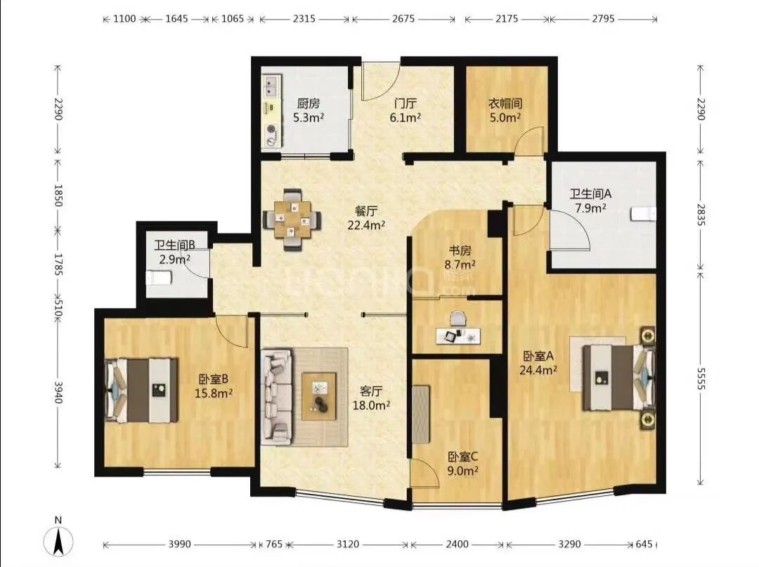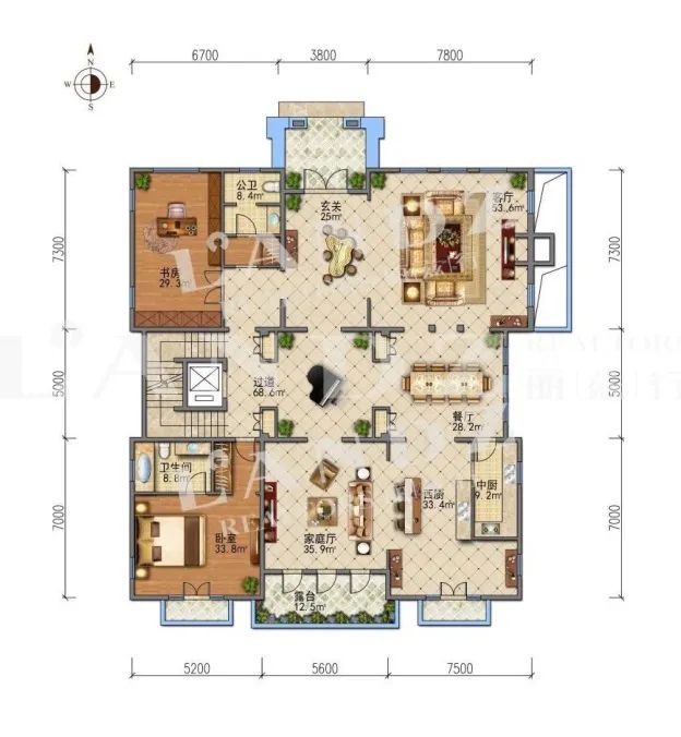 另外配有客卫,若是老人年纪渐长生病休养需要陪护时,书房还能改造成护理人员的卧室,方便照顾起居。