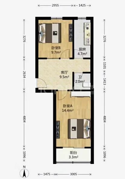 南北双向两卧室,窄面宽、长进深是当时最常见的户型,出于爱和另外一些原因,老人们会默认住次卧,大卧室给小夫妻住。