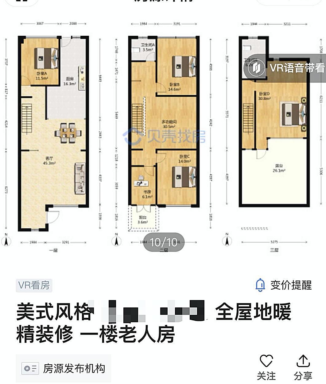 这是一个早期别墅项目的户型图,窄长户型的伪别墅就不多论述了,那个年代很常见。被默认为老人房的一层卧室A是北向,面积较小又没有卫生间,在实际居住中,多用于书房或者储藏室,也可以作为工人房,但作为老人房实在有点不过脑。