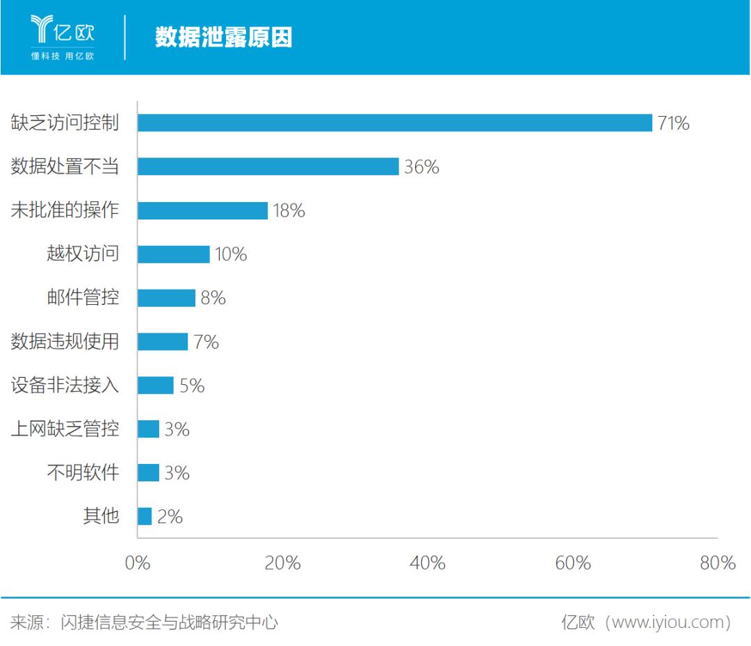 据闪捷信息安全与战略研究中心统计,71%的数据泄露原因是缺乏对数据的访问控制,36%的数据泄漏原因是数据处置不当。综合来看,数据泄露的原因主要是因为企业技术管理的“不作为”、“乱作为”,也侧面反映了企业对数据安全的漠视。