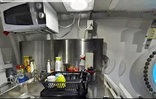 实验室内,卧室里有六个床位,浴室里有淋浴器、水池,厨房里有微波炉、电冰箱,工作室里有电脑和潜水装置。