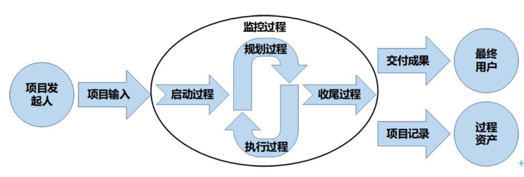 如图所示,体现了项目从发起到交付的全流程,其中监控过程覆盖启动、规划、执行、收尾4个过程,以确保所有过程都处在可控的情况下;项目成果最终交付给用户,项目过程形成的记录作为公司过程资产保留。