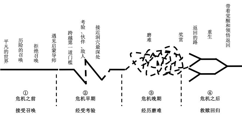 如果我们把英雄成长历程看作是一次危机中的历险,那么英雄之旅的4个阶段也可以理解为危机过程的4个阶段:危机之前(接受召唤)、危机早期(经受考验)、危机晚期(经历磨难)和危机之后(救赎回归)。