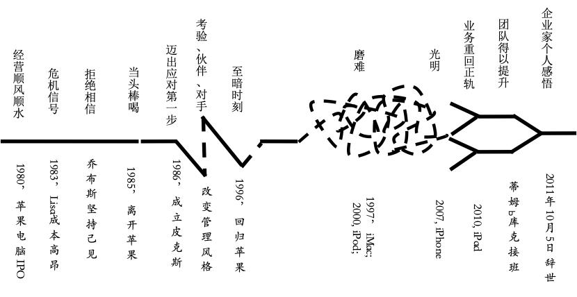 1996年,苹果电脑公司经营陷入困局,市场份额由鼎盛时期的16%跌到4%。乔布斯在苹果电脑公司的至暗时刻回归,开始了一系列大刀阔斧的改革,停止了不合理的研发和生产投入,结束了和微软多年的专利纠纷,并开始研发新产品iMac和OS X操作系统。在之后的几年里,乔布斯带领苹果公司不断探索新的发展方向,在不确定中找到了数字化和移动化的确定性未来方向,推出了划时代的产品iPod播放器,彻底改变了音乐行业,也带领着公司走出了危机。