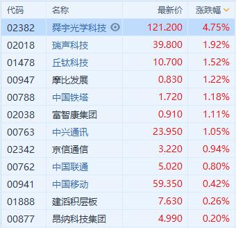 5月11日,港股华为概念股普遍上涨,其中,舜宇光学科技(02382.HK)盘中一度涨近8%,领涨整个概念板块。