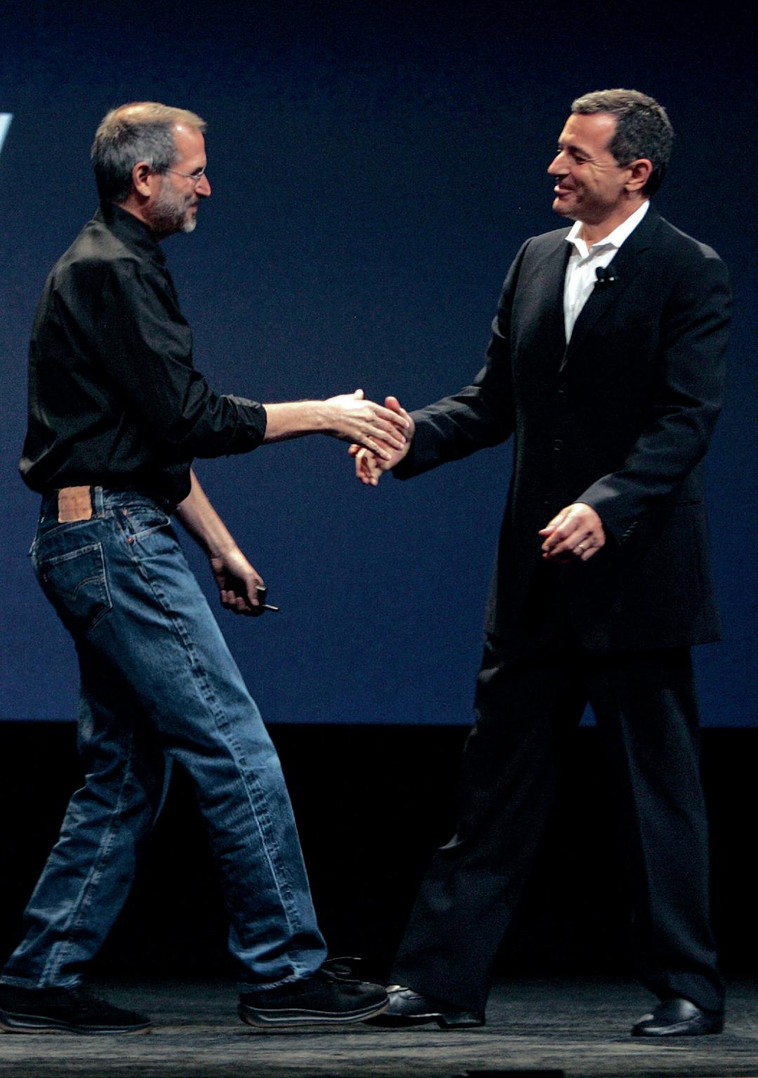▲2005年,艾格在和乔布斯一起宣布,ABC电视节目将会在新款视频iPod上播出,这是两人友谊中的一次重大突破。