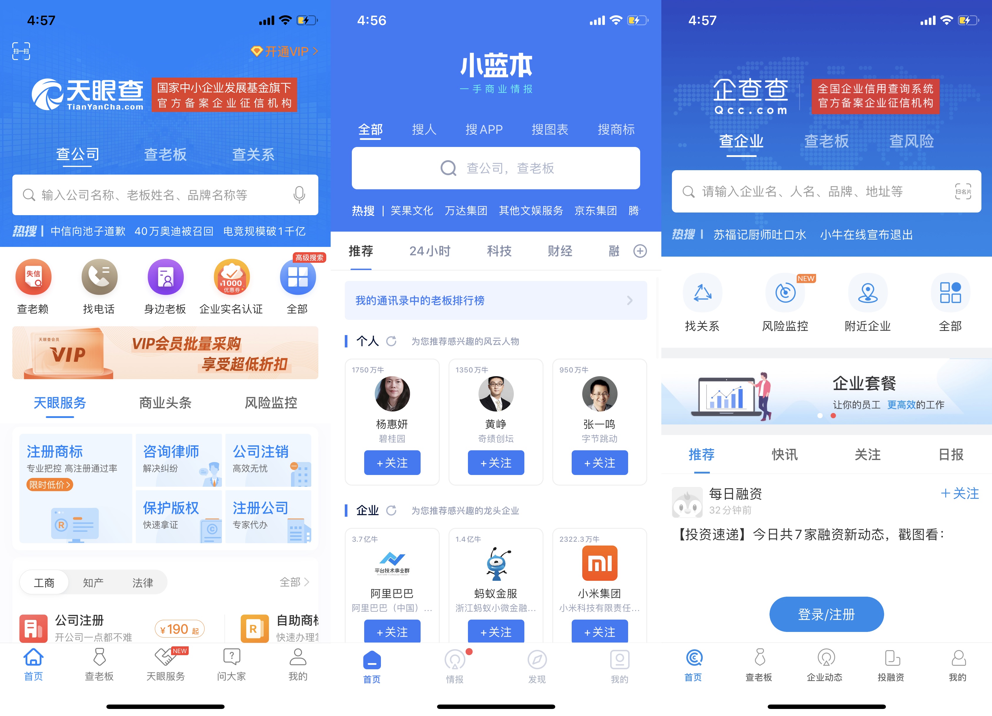 5年内以不低于50亿元的市值将小蓝本送至IPO——51信用卡压力不小。所谓商业资讯搜索工具的小蓝本,主打企业信息查询。与另外两大企业信息查询App天眼查、企查查相比,小蓝本在功能上似乎并无太多过人之处,在三者首页的主要功能中,均包含“查公司、查老板”。