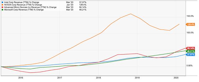 上面的图表显示了英特尔、英伟达(NVDA)、AMD(AMD)和微软(MSFT)过去5年的收入增长。英特尔是一家大公司,它在许多不同的领域展开竞争,包括微芯片、云计算和硬件。虽然英特尔看起来远没有输的迹象,但在四家公司中,它的数字确实更糟。不出所料,英伟达在收入增长和估值(取决于我们使用的衡量标准)方面遥遥领先。