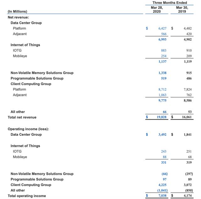上面的摘录显示了2019年和2020年第一季度的收入。首先,数据中心的收入增长了42.59%。正如我们在AMD的文章中所讨论的,数据中心和内存存储是未来收入增长的重点。随着我们向完全基于云计算的互联网迈进,对微芯片的需求将来自于此。提及内存存储,我们还可以看到英特尔在这方面表现出色,季度营收增长了46%。英特尔不仅有技术,而且有规模成为未来数据和内存存储的主要供应商。