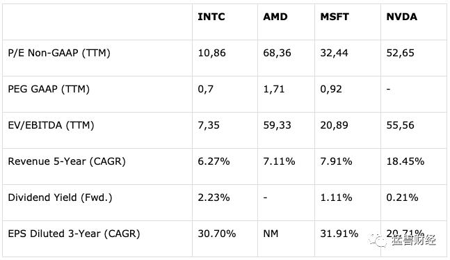 下表显示了英特尔及其同行的一些估值、增长和盈利指标。