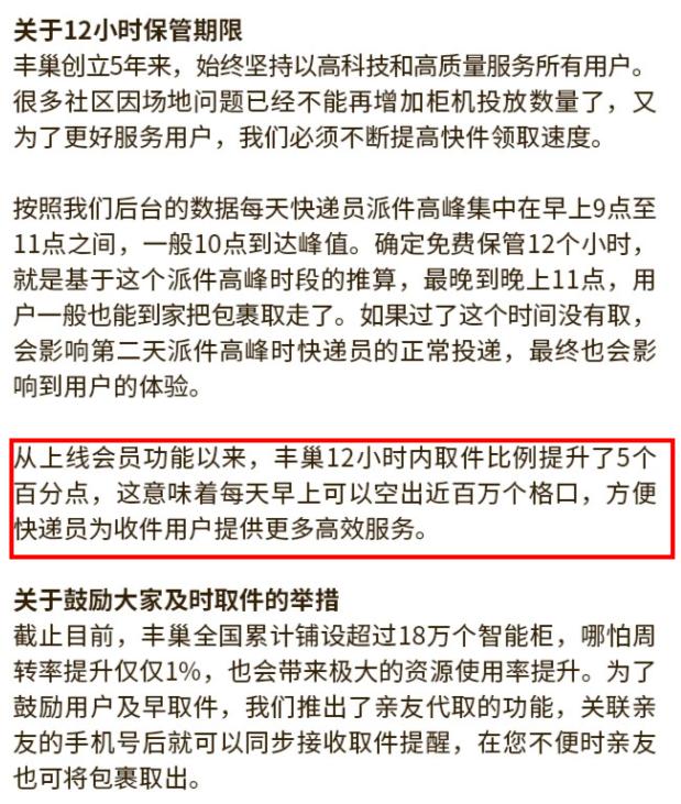 丰巢此后公布的数据也称,收费的确达到了让用户早取件的一定预期:12小时内取件率增加5%。