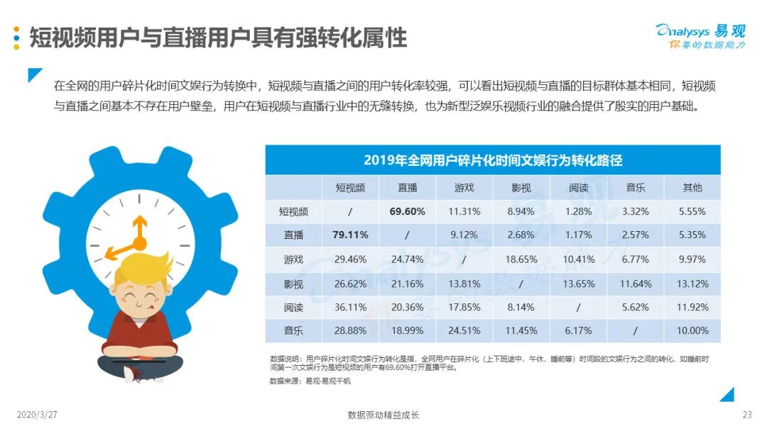 从用户去看,易观的报告提到,在全网用户文娱用户碎片化时间转化中,短视频与直播间的转化较强,短视频用户中69.6%的用户转化路径是直播、79.11%的直播用户转化路径是短视频。