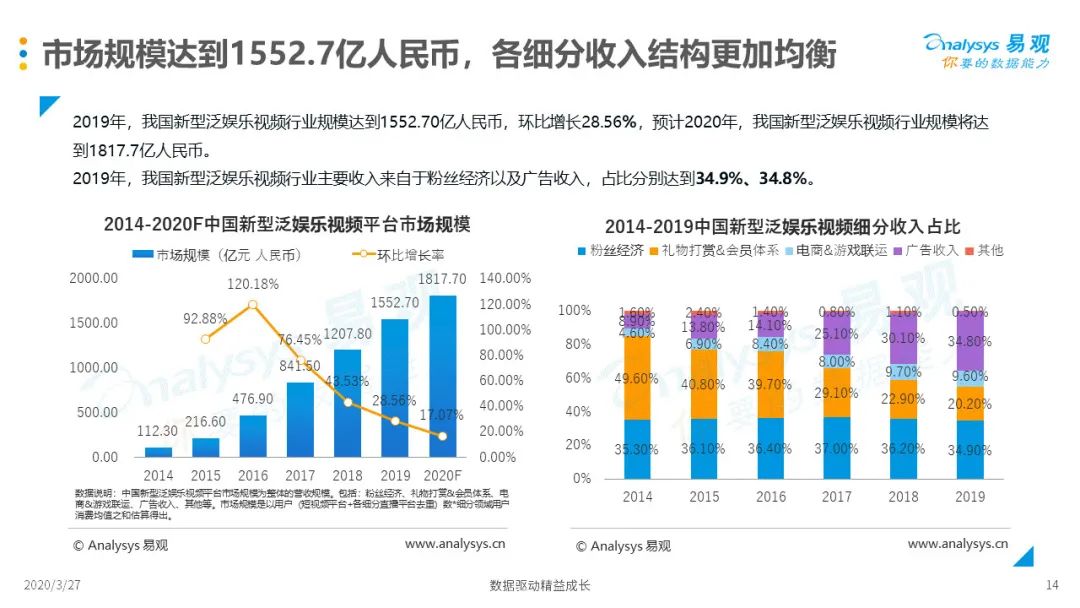 而易观的数据显示我国2019年新型泛娱乐视频的产业规模达到了1552.7亿元,环比增长28.56%,预计2020年市场会进一步扩大到1871.7亿元。