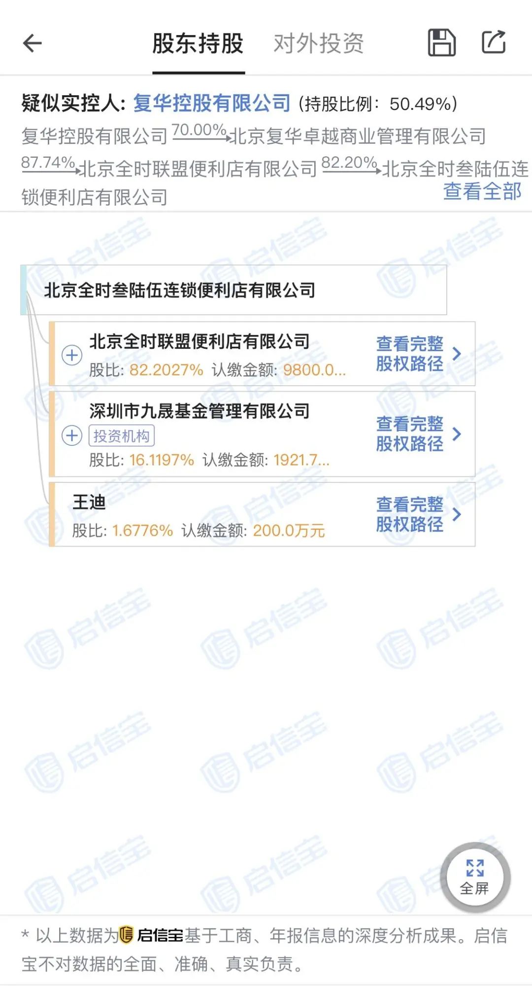 但是细查全时的股权结构就会发现,事实并非如此。目前全时叁陆伍连锁便利店有限公司,实控人依然是复华,持股比例50.49%。全时叁陆伍公司的股权结构图如下:
