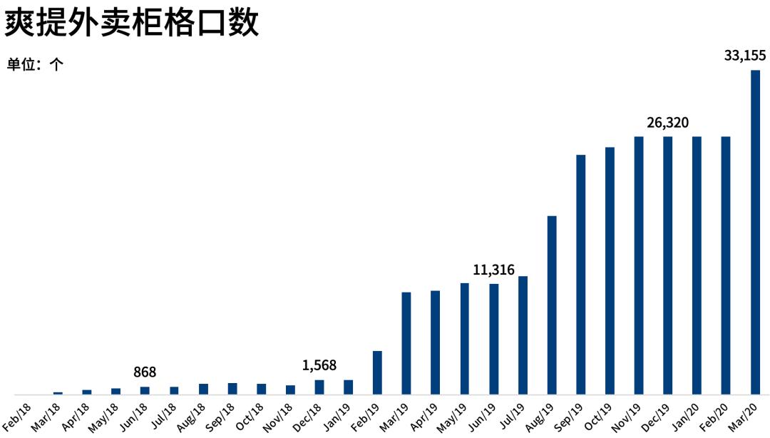 公司从2018年3月开始运营第一家高校,此后随着高校订单数量的增多,外卖柜格口数量一直在持续增长,从2018年6月的868个,一路上涨至2020年3月的33,000多格。