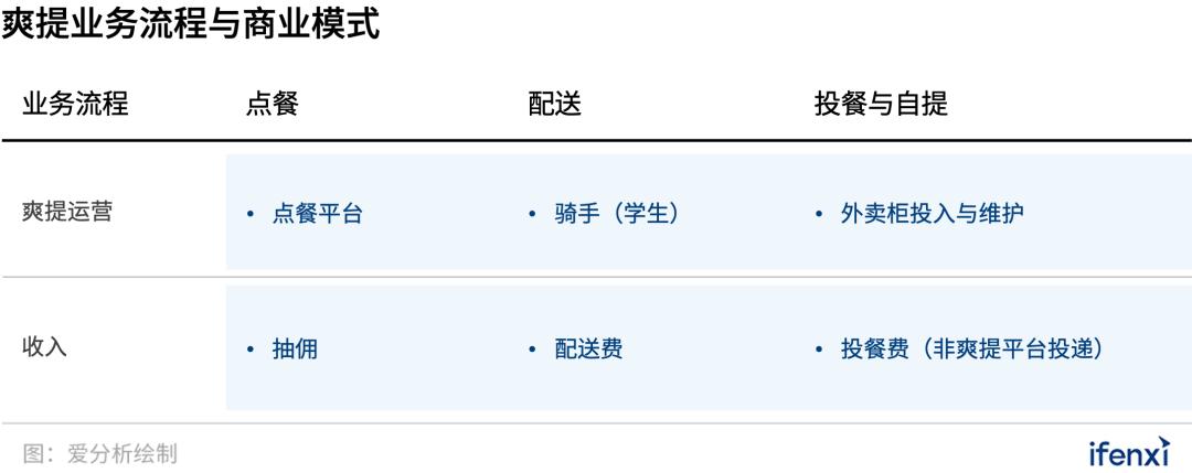 爽提在跟高校的合作中,会与校方签订长期正式合同,这种合作方式可以保证爽提在校园内的长期稳定运营。其业务流程分为点餐、配送、投餐(外卖配送服务人员)/自提(顾客)三个环节,从商业模式角度来看,三个环节的运营均可产生收入。