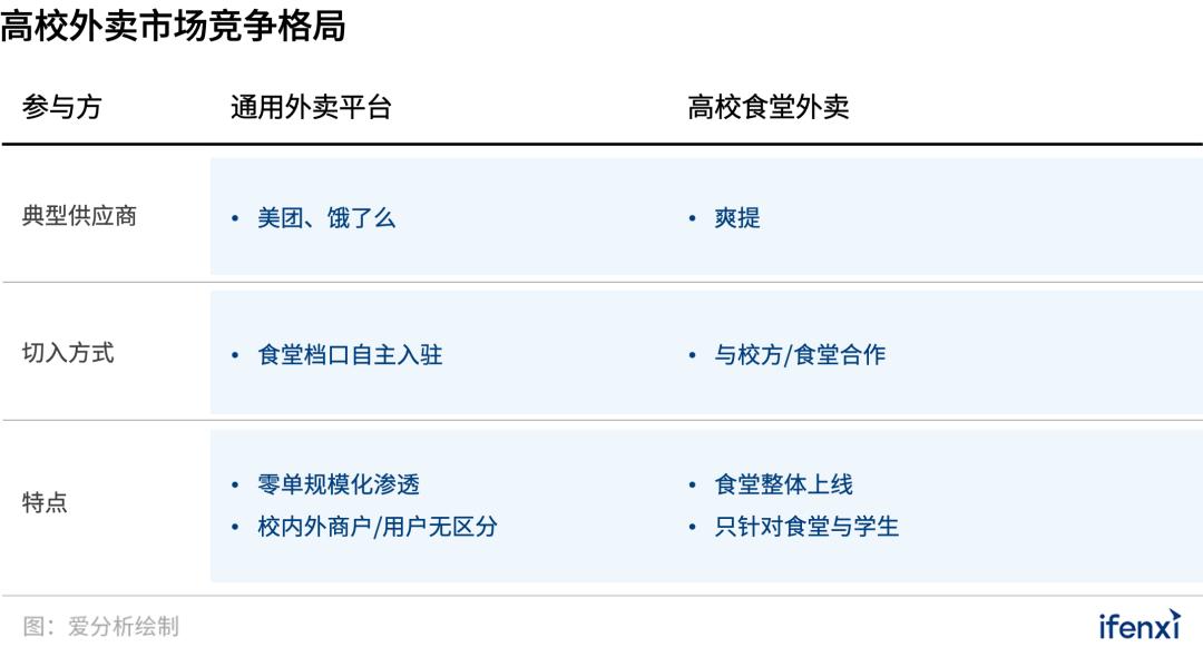 从当前的市场情况来看,高校餐饮外卖市场大体有两类玩家,第一类是通用外卖平台,美团、饿了么是典型代表,第二类是高校食堂外卖运营商,爽提是这一模式的典型代表,也是高校食堂外卖自提模式的首创者。