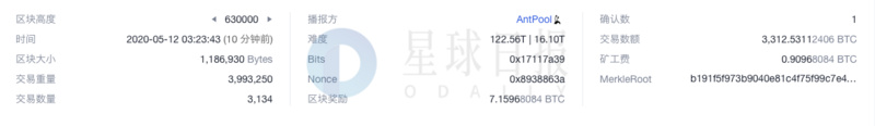 欧科云链OKLink数据显示,BTC于5月12日03:23:43在区块高度630000完成第三次区块奖励减半,播报方为AntPool,区块奖励已从12.5 BTC降至6.25BTC。
