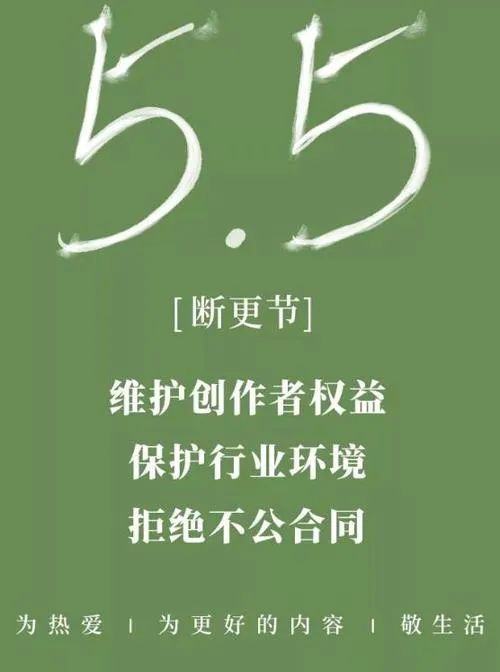5月5日,部分网文作家发起“55断更节”以抵制霸权合同,宣布在当天全部停止更新,以此维护自己的版权和著作权。不过,这些维权作家们表示,并不强制所有写手都必须“断更”。“就算不断更,在开单章、本章说、读者群等地方提及‘五五断更节’也是支持的方式。”