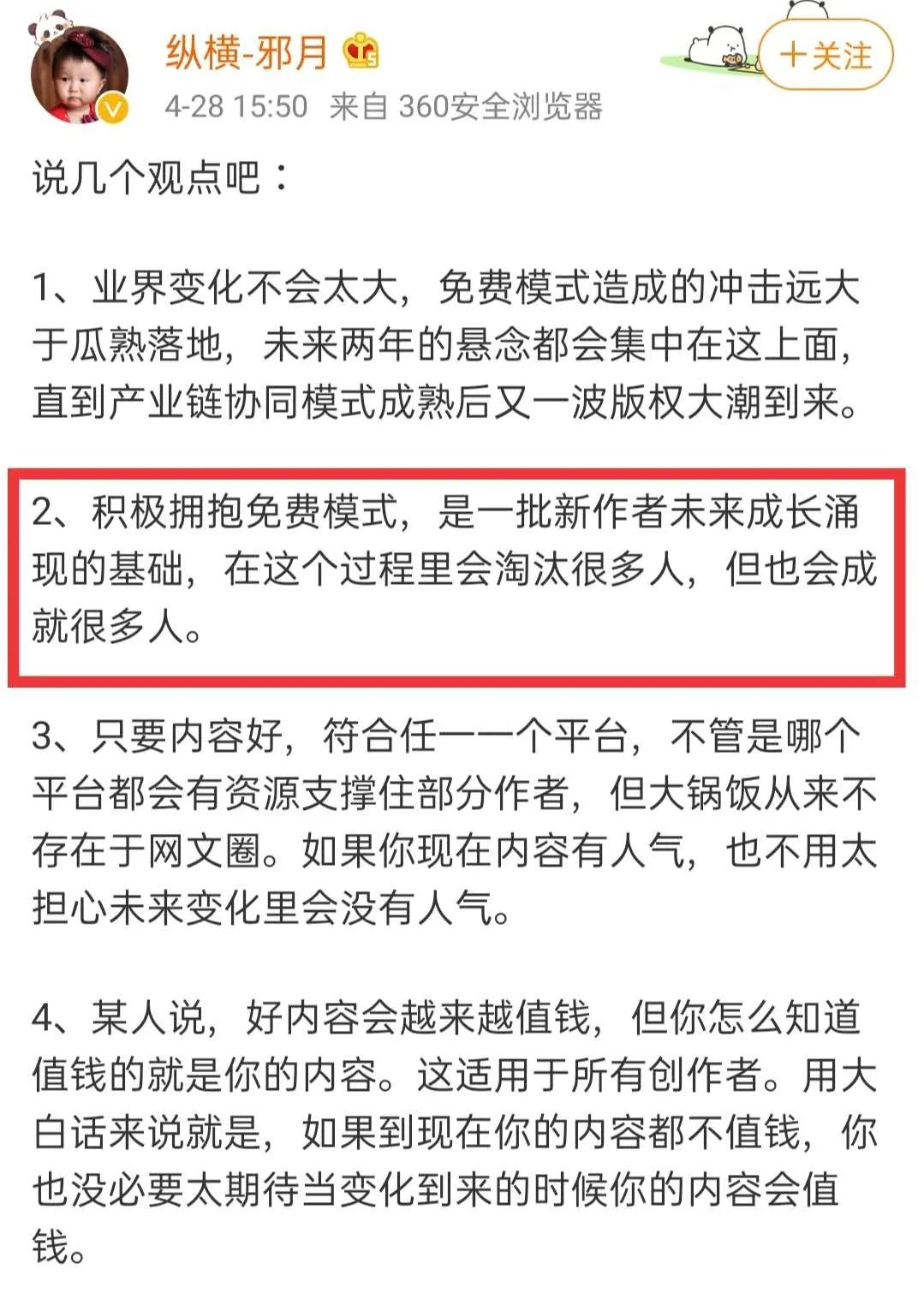 另外,阅文的竞争对手、纵横中文网的总编邪月,近来在微博上也非常活跃。他提出,“对大部分以订阅为生的作家来说,我的建议就是拥抱免费,积极求生。”他也解释道,拥抱免费的对象,是受到免费模式冲击的这部分人。