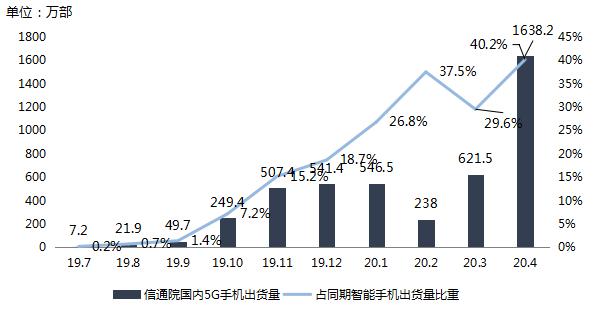5G手机方面,2020年4月,国内市场5G手机出货量为1638.2万部,1-4月, 国内市场5G手机累计出货量3044.1万部。