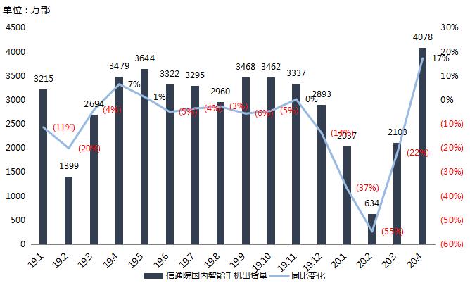 数据显示,2020年4月,智能手机出货量4078.2万部,环比增长93.9%,同比增长17.2%。