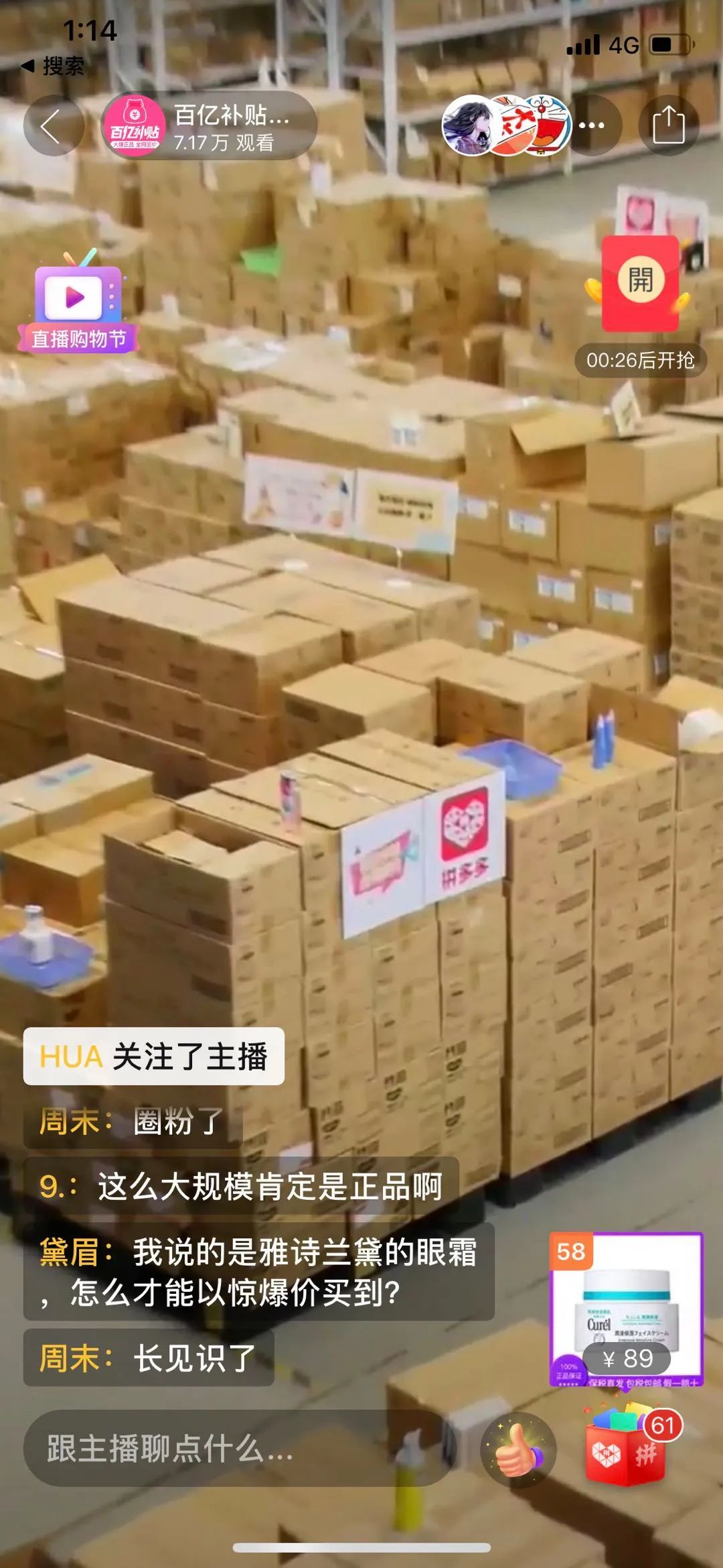 一瓶珂润面霜,市场价159元,拼多多直播价卖89元。我带着好奇,点开了这场直播,时间是5月8日中午,地点是一个巨大保税仓内,一个俯视镜头,扫视了仓库内堆积如山的集装箱,其中有一部分贴有醒目的拼多多logo。