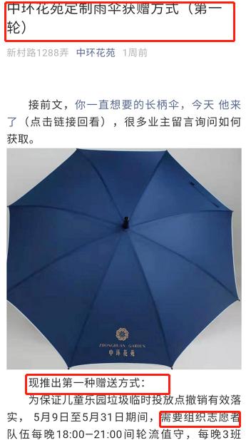 为了鼓励小区内业主积极报名志愿者活动,还推出了这样的激励措施,参加志愿者活动赠送小区定制版雨伞(有利于增加小区业主自豪荣誉感)