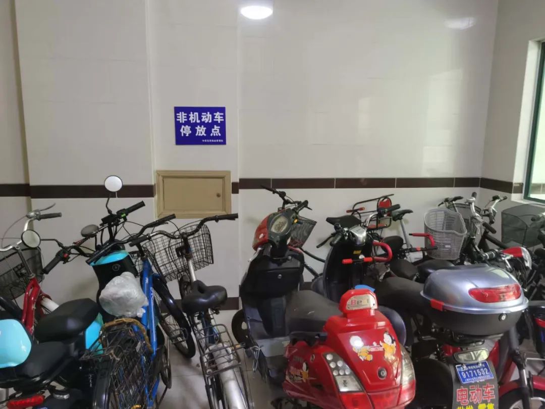 比如在很多老小区很容易出现电瓶车乱停乱放的情况,中环花苑利用每栋楼空余的室内空间,安排了这样的非机动车的停放点,也添加了标语来引导大家