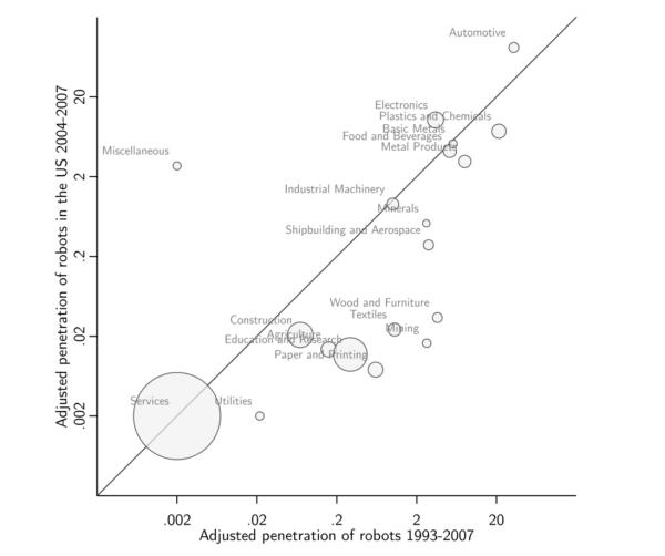 首先,研究发现,是技术推动了工业机器人在美国的渗透,这种渗透也与欧洲广泛采用机器人有着高度相关性。而且,机器人渗透也呈现出行业异质性。