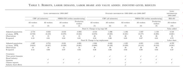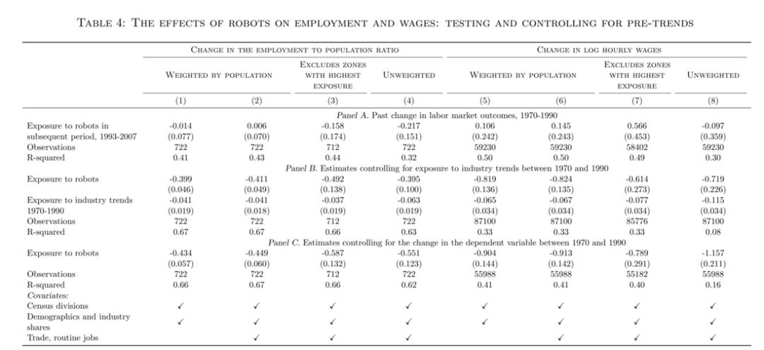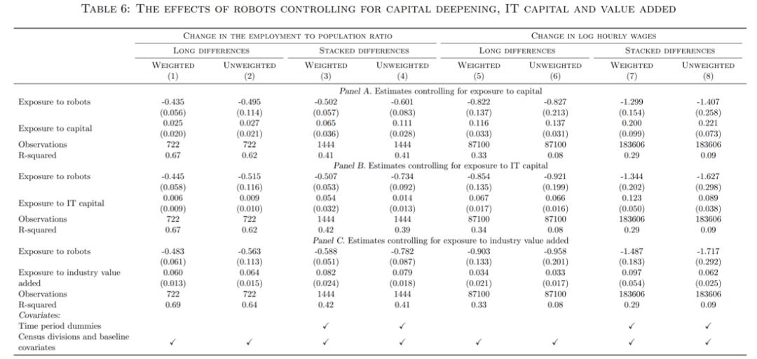 通过在回归中控制住传统方法的影响后,他们发现几乎没有影响。而且,结果也与之前的理论重点是一致的。即,自动化在概念上不同于资本积累和其他类型的技术变化,这些变量与就业和工资变化呈正相关。一种可能的解释原因是,传统方法不会产生替代效应(displacement effect)。