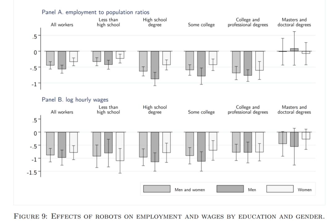 在学历方面,研究惊讶地发现,研究生学位对工人就业和工资来说,没有积极影响。一种可能的解释是,相对于其他计算机辅助技术,工业机器人并没有直接需要补充高技能工人。